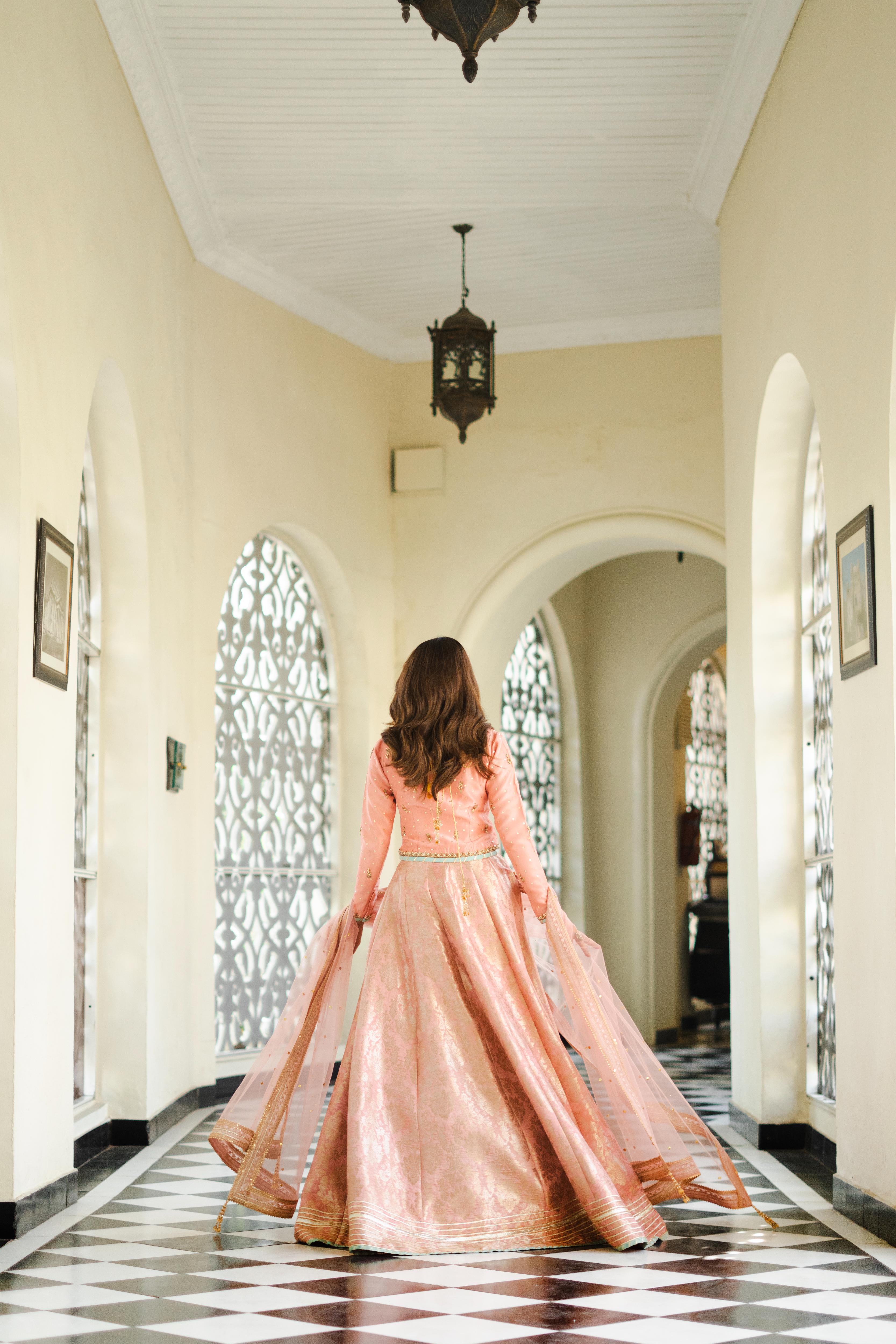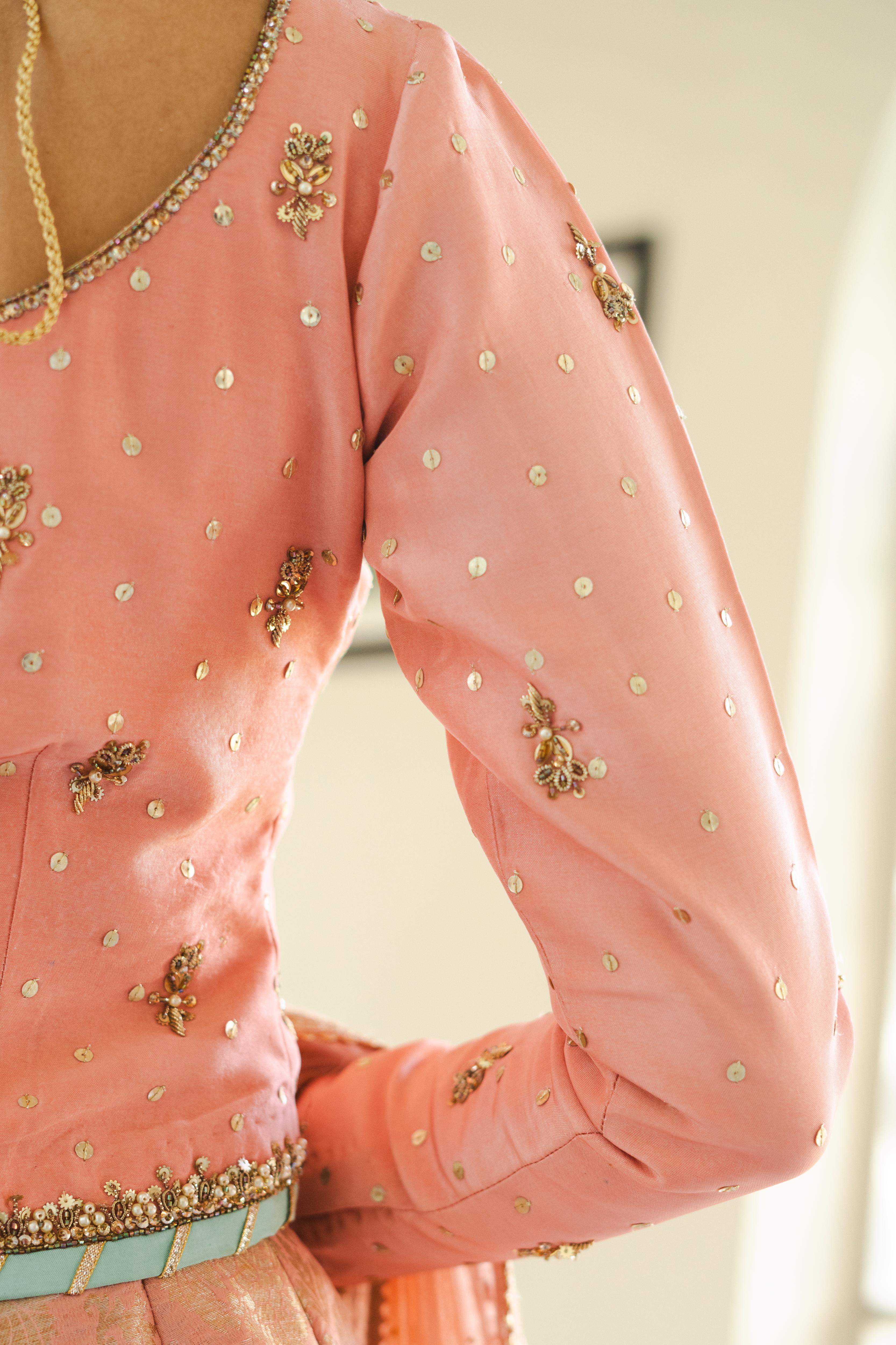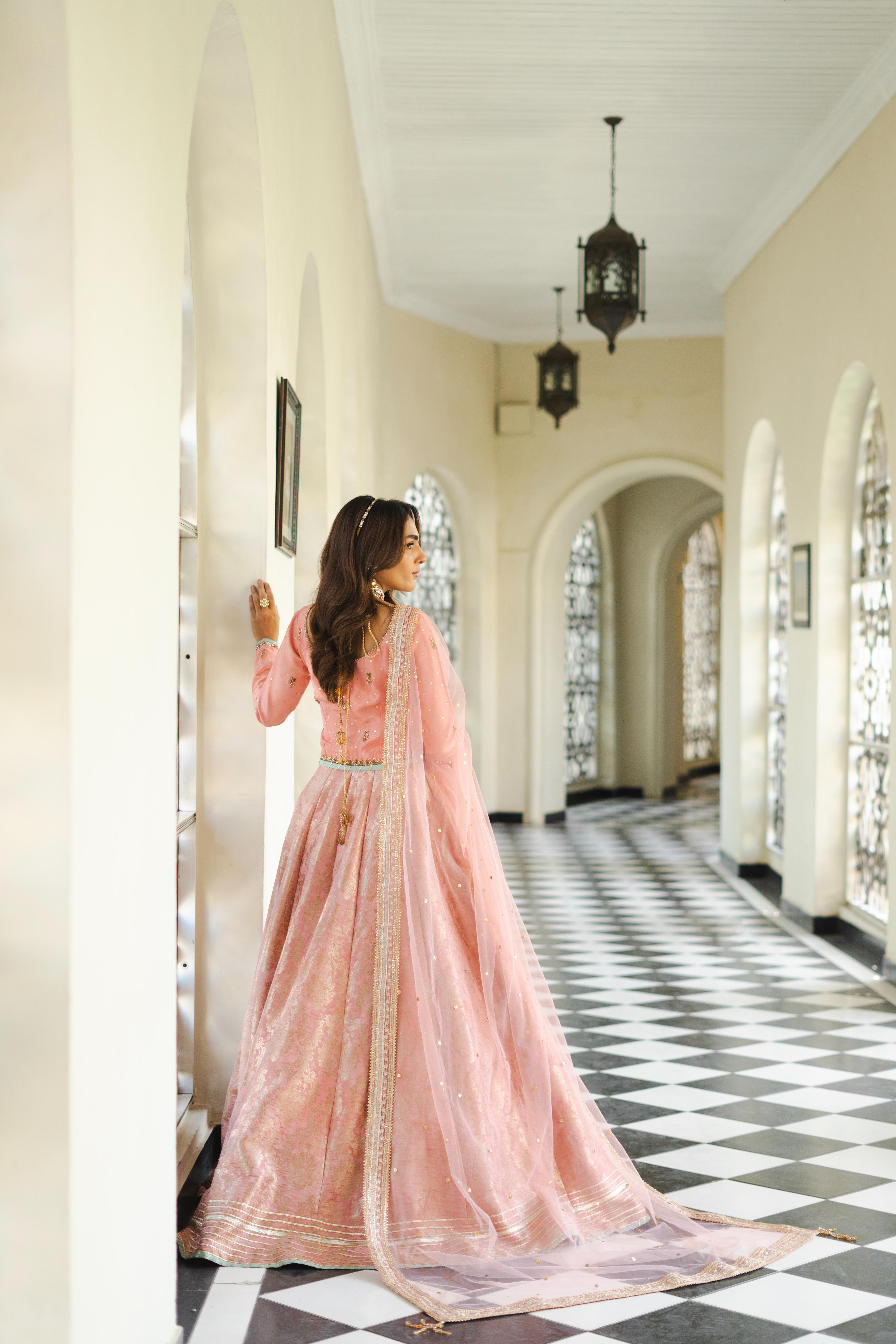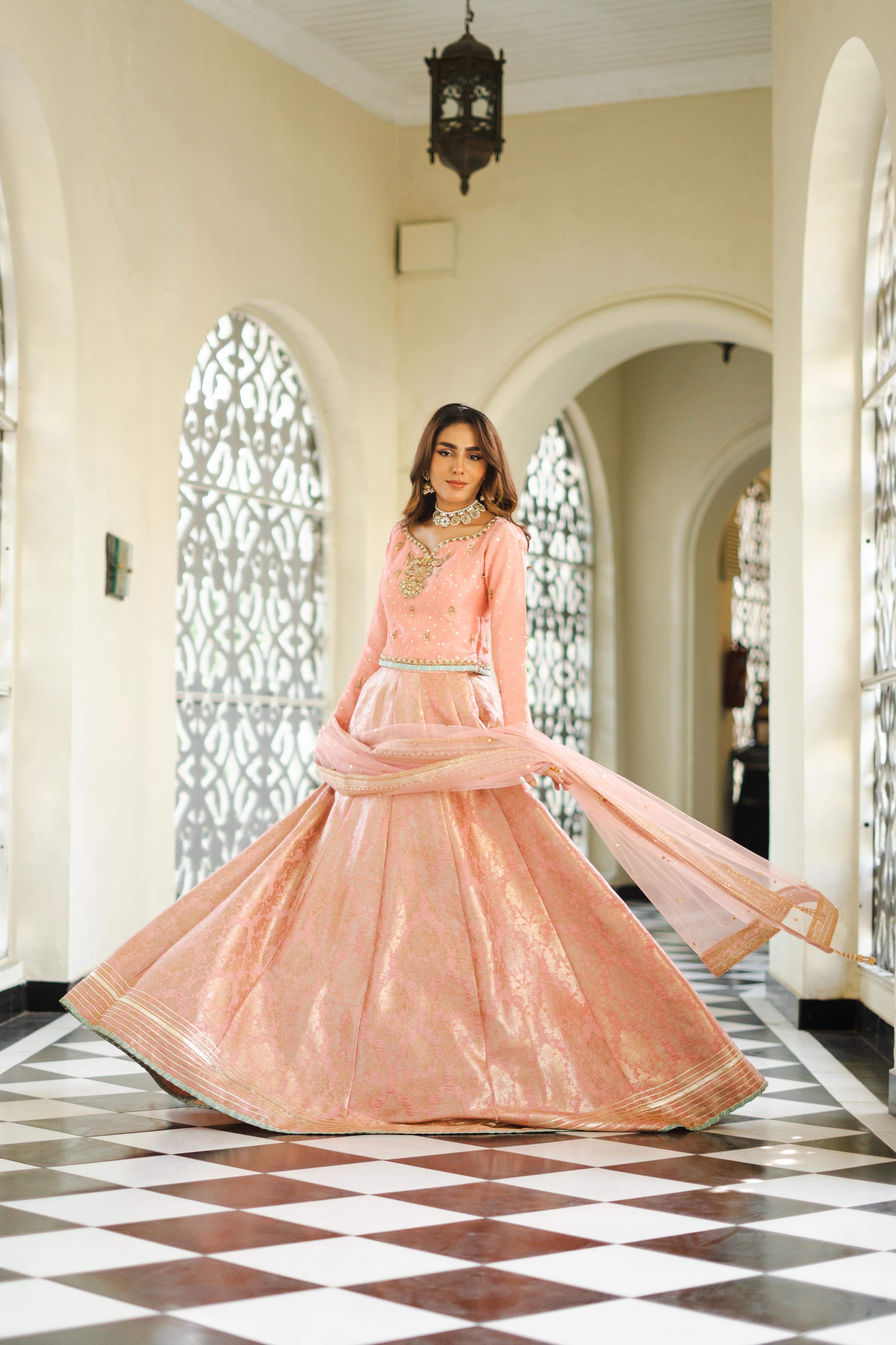 Maleeka - Readymade Three Piece Embroidered Lengha in Pastel Pink with Motifs, Pants and Dupatta