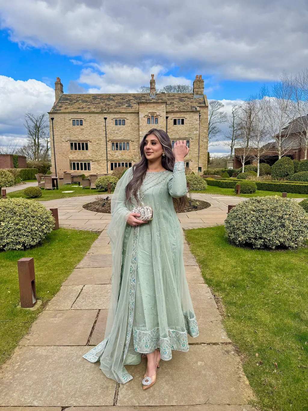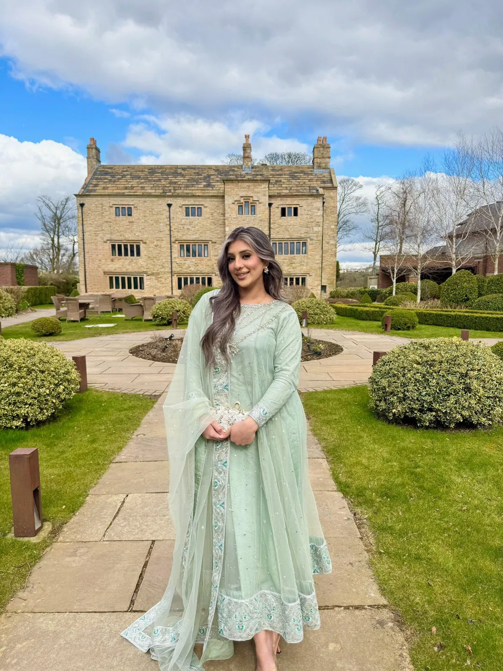 Sahar - Embroidered Readymade Three Piece Stitched Flare Suit in Pistachio Green with Dupatta