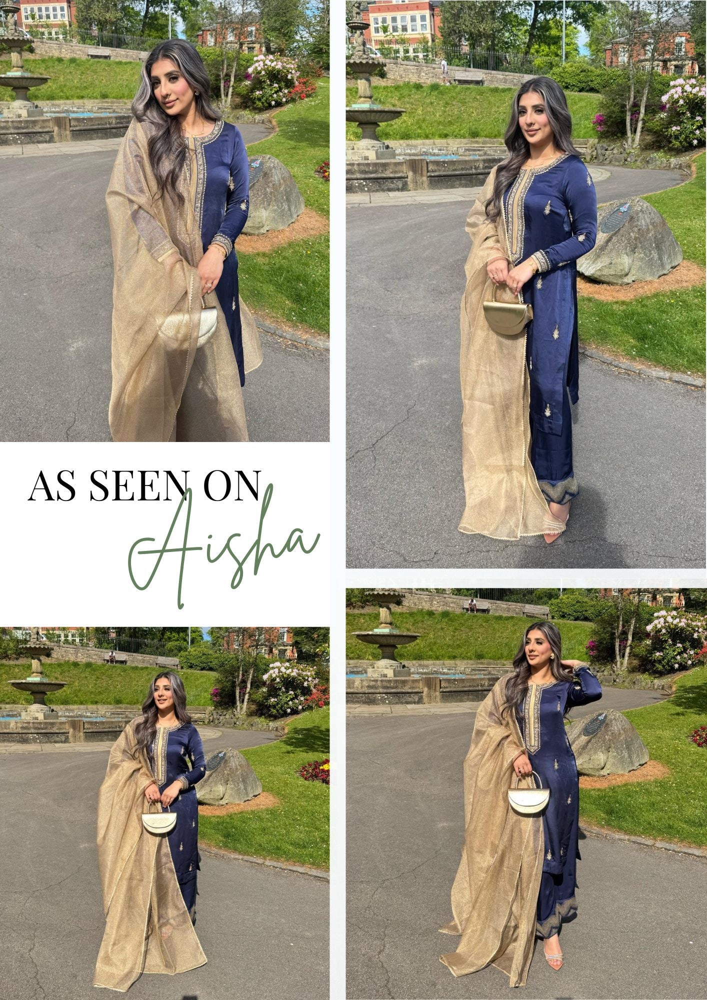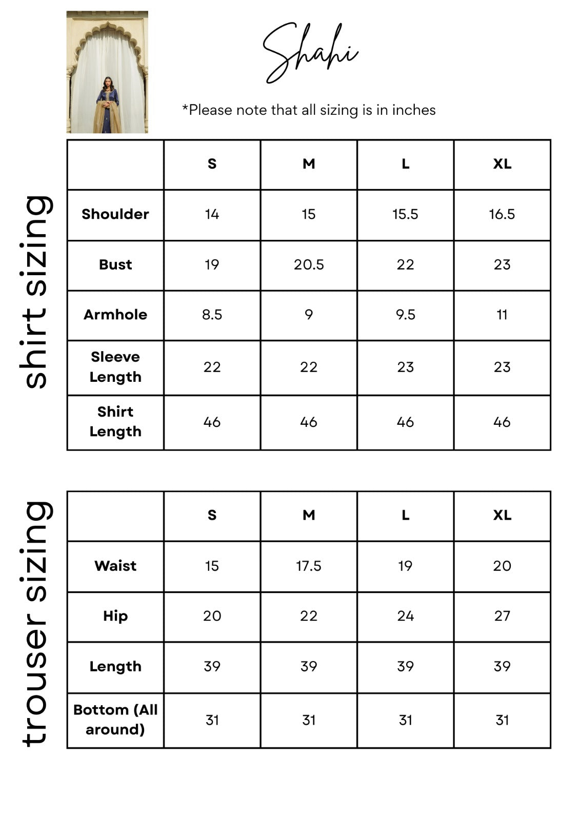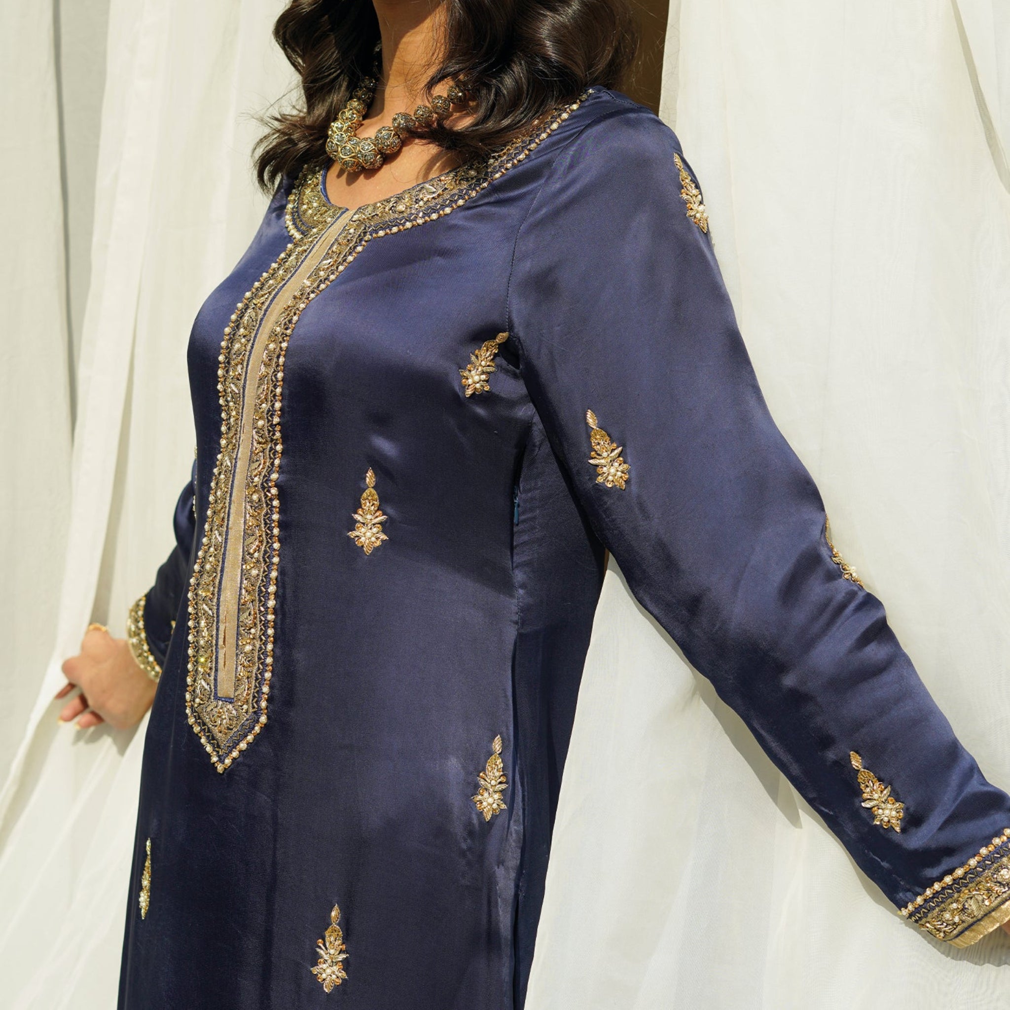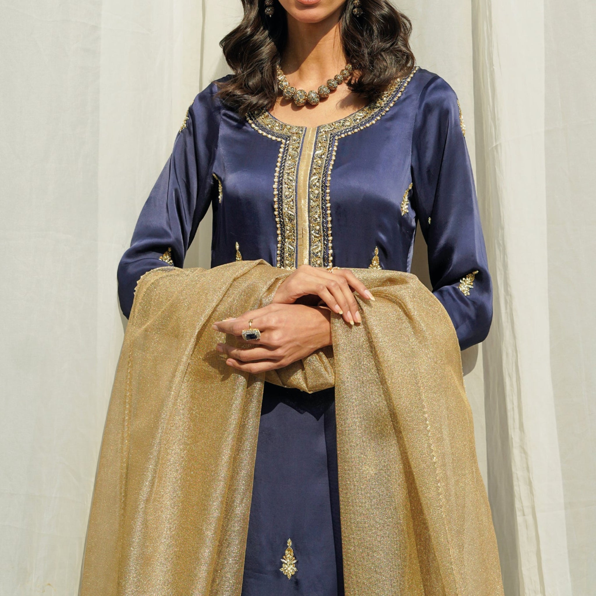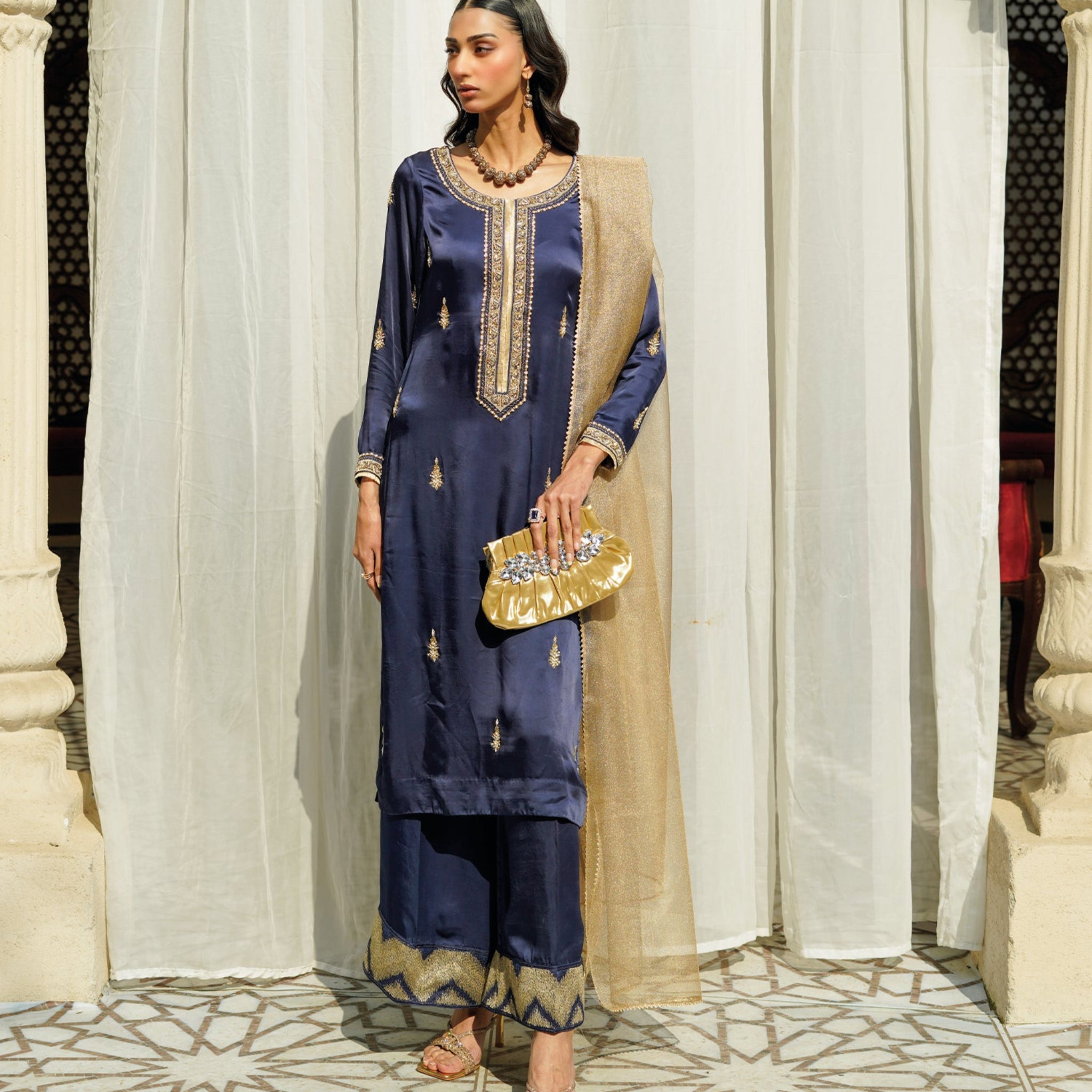 Shahi - Embroidered Readymade Three Piece in Navy Blue with Kurta, Trouser and Zari Net Dupatta