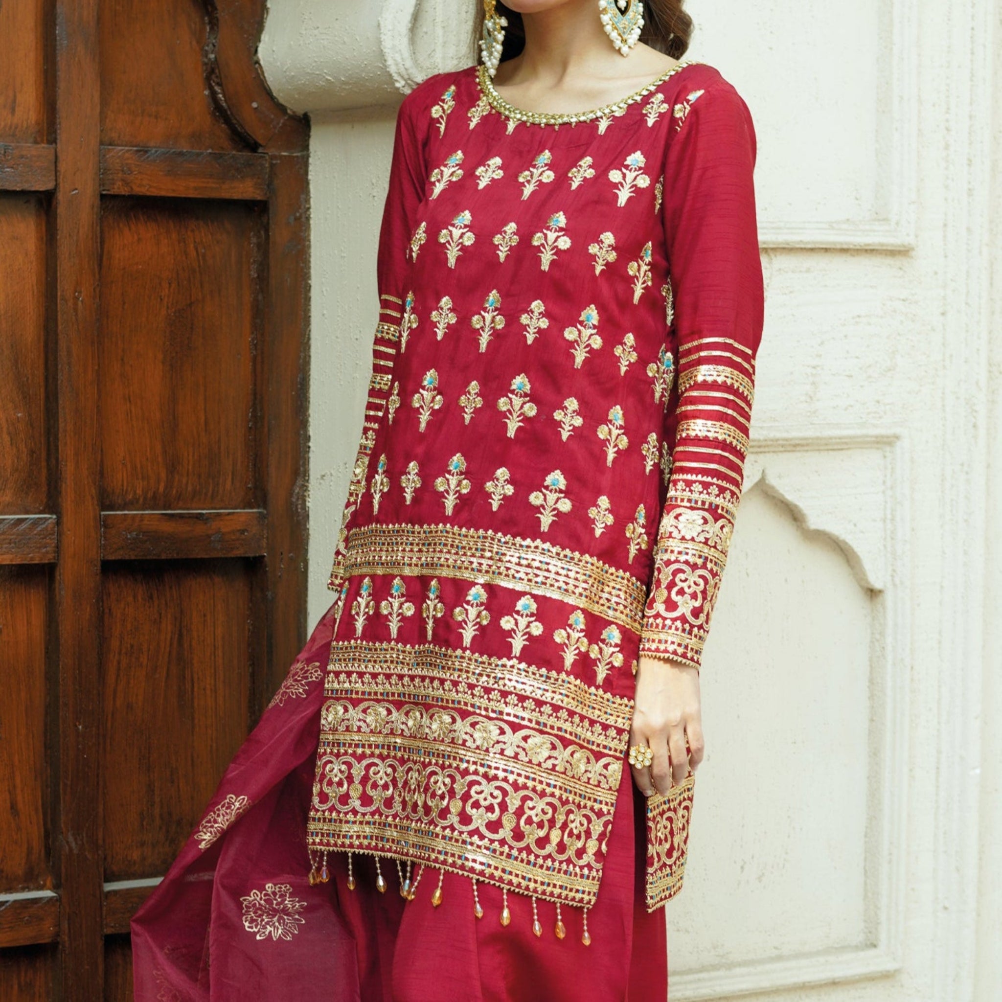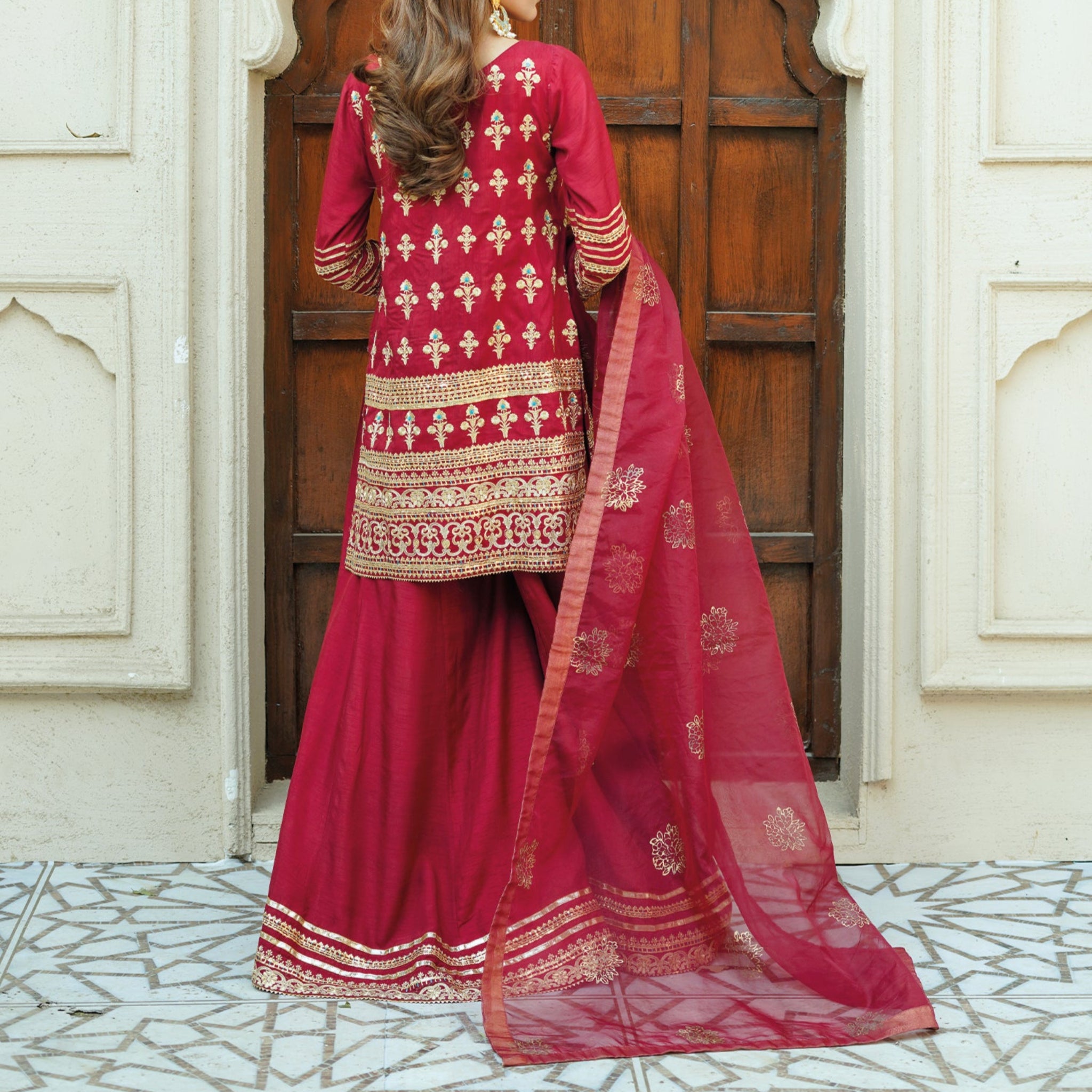 Surkh - Embroidered Readymade Three Piece Sharara in Ruby Red with Golden Embellishments