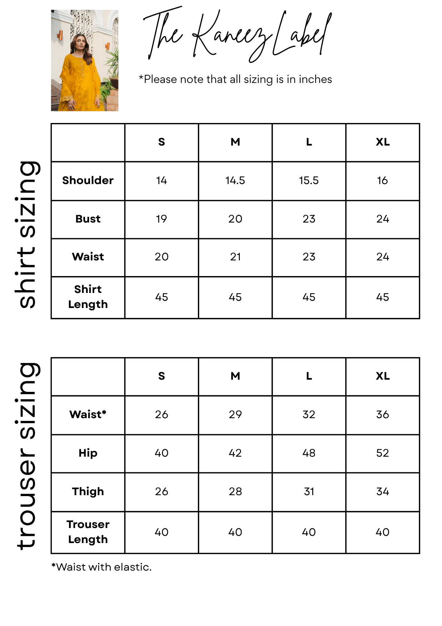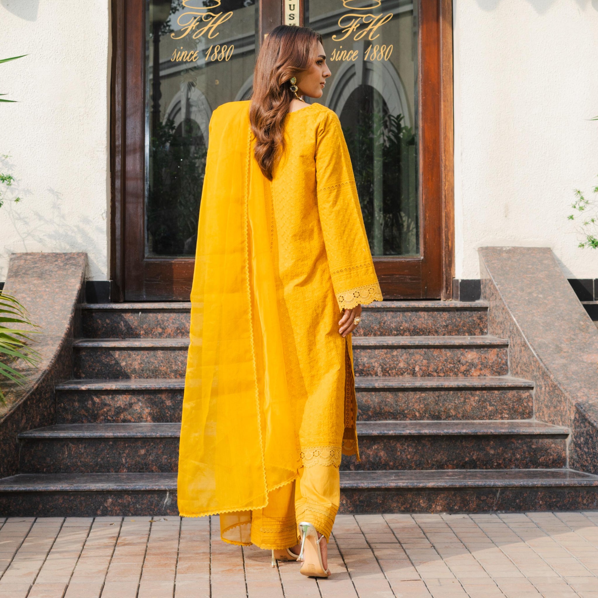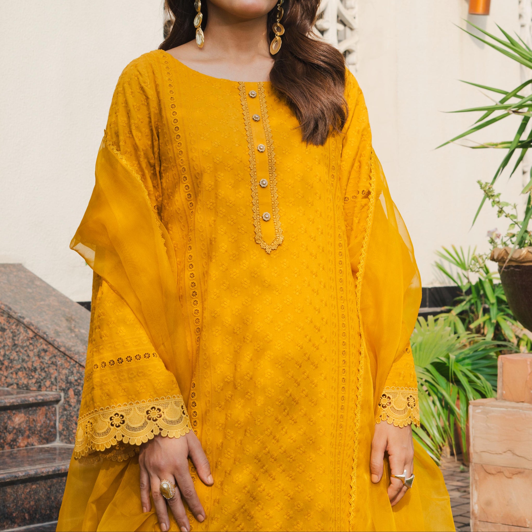 Kaneez - Readymade Chikankari Three Piece Shalwar Kameez in Mustard Yellow with Matching Organza Dupatta and Motif Detailing