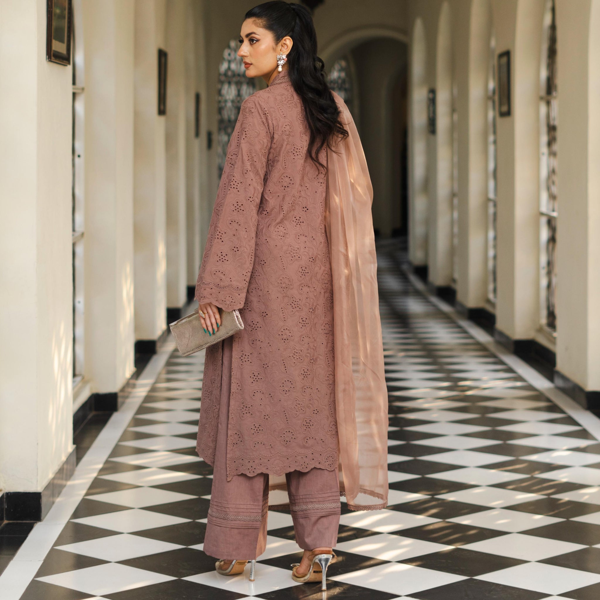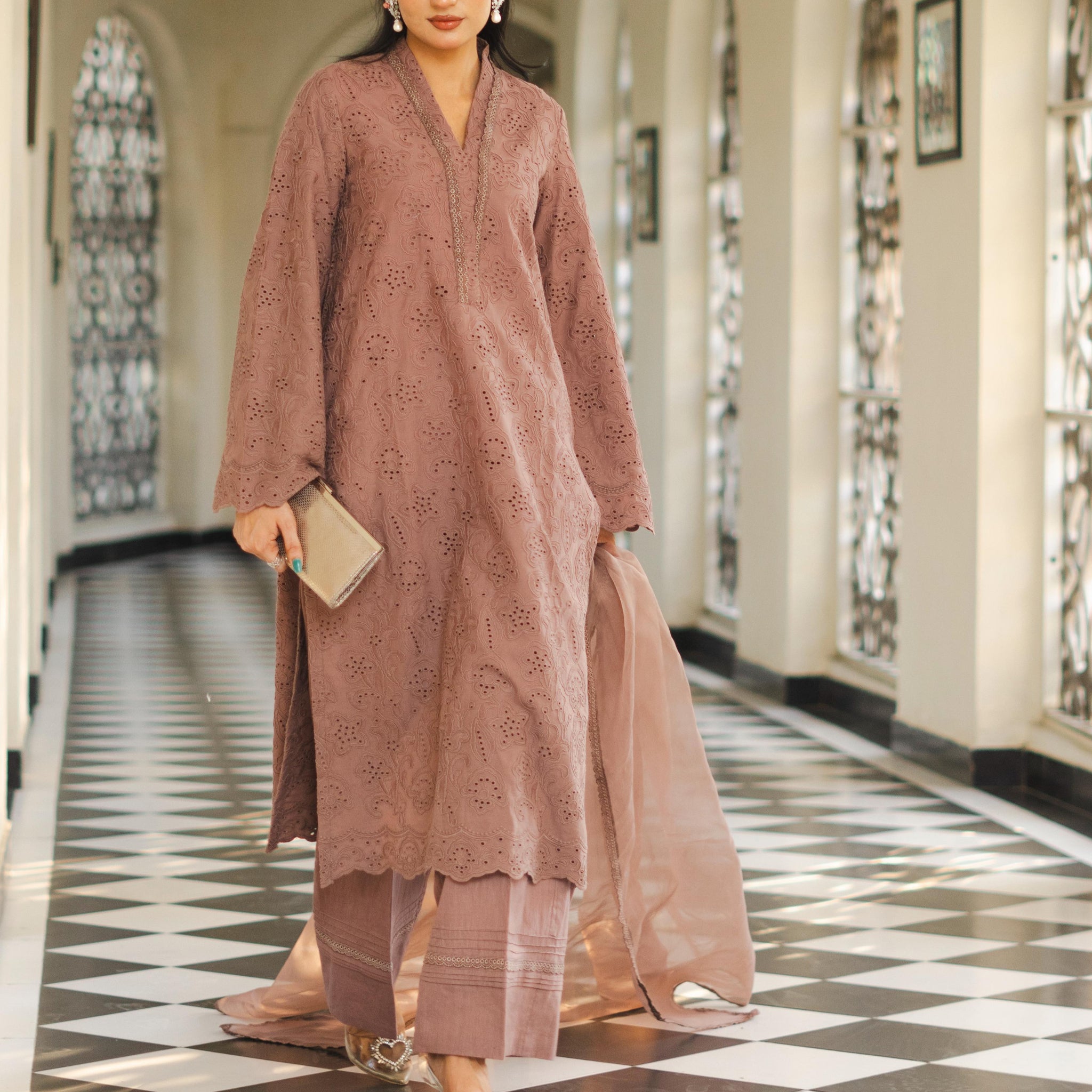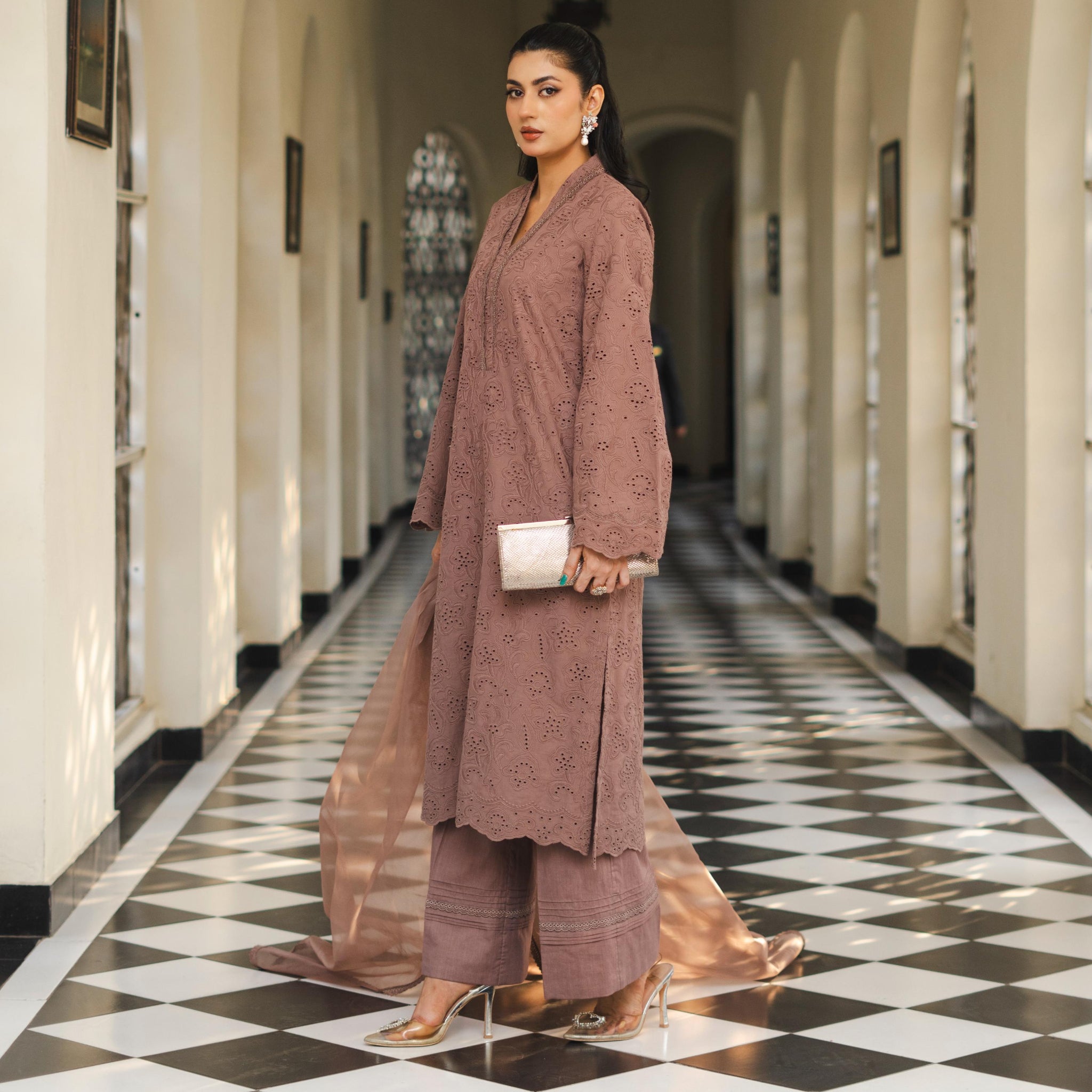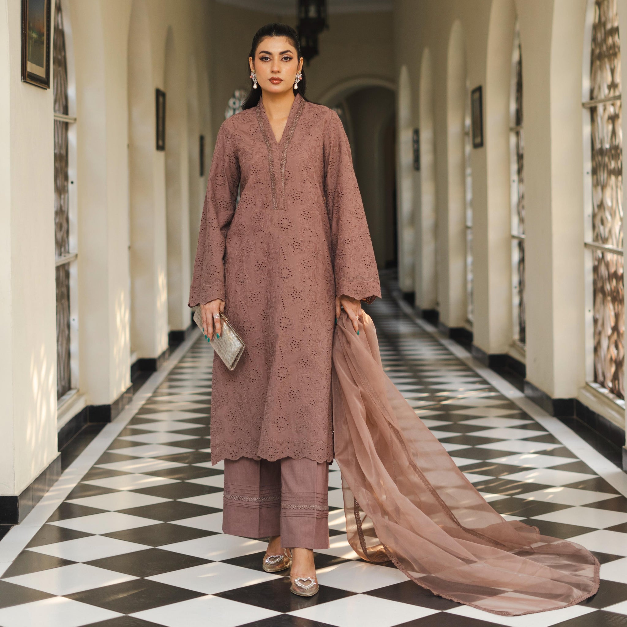 Koza - Readymade Chikankari Three Piece Shalwar Kameez in Brown Mauve with Matching Dupatta and Floral Detailing