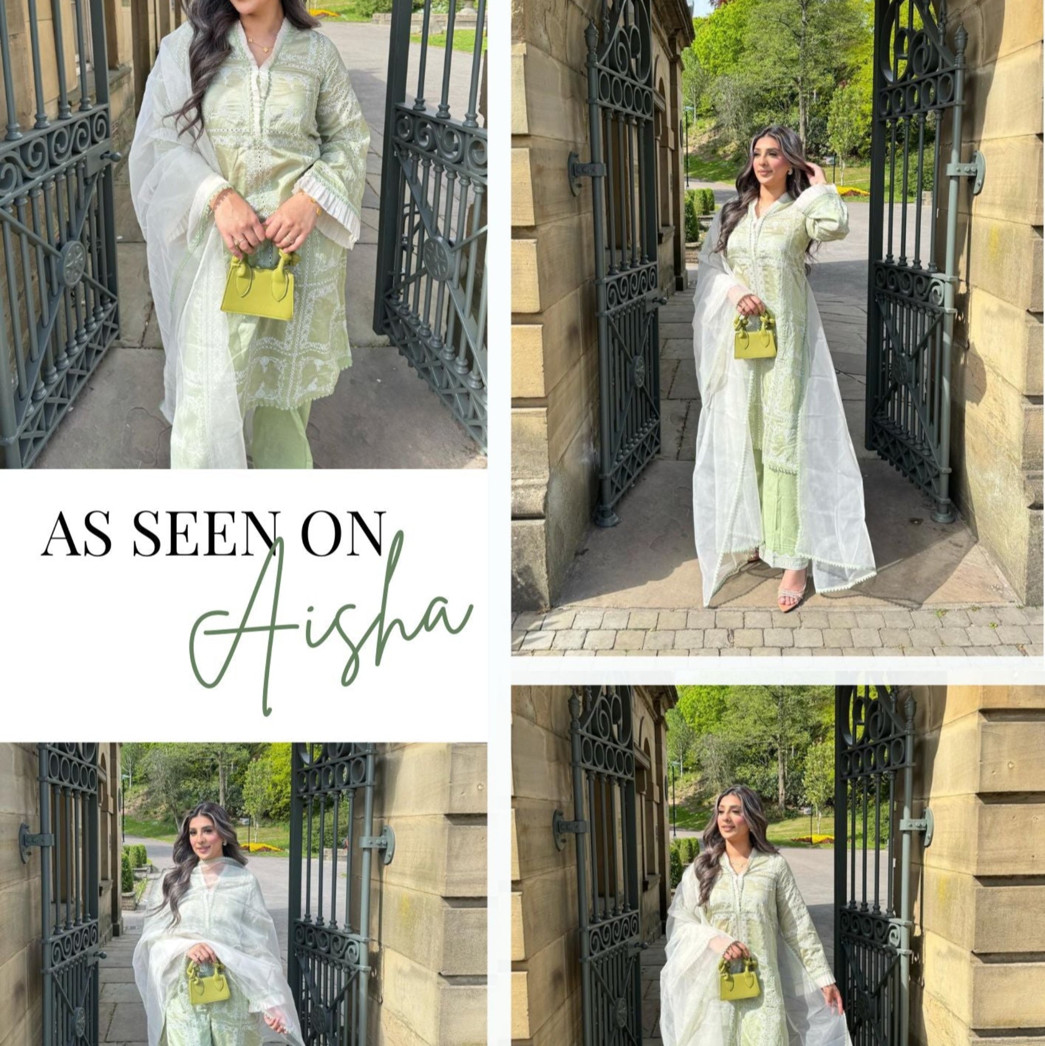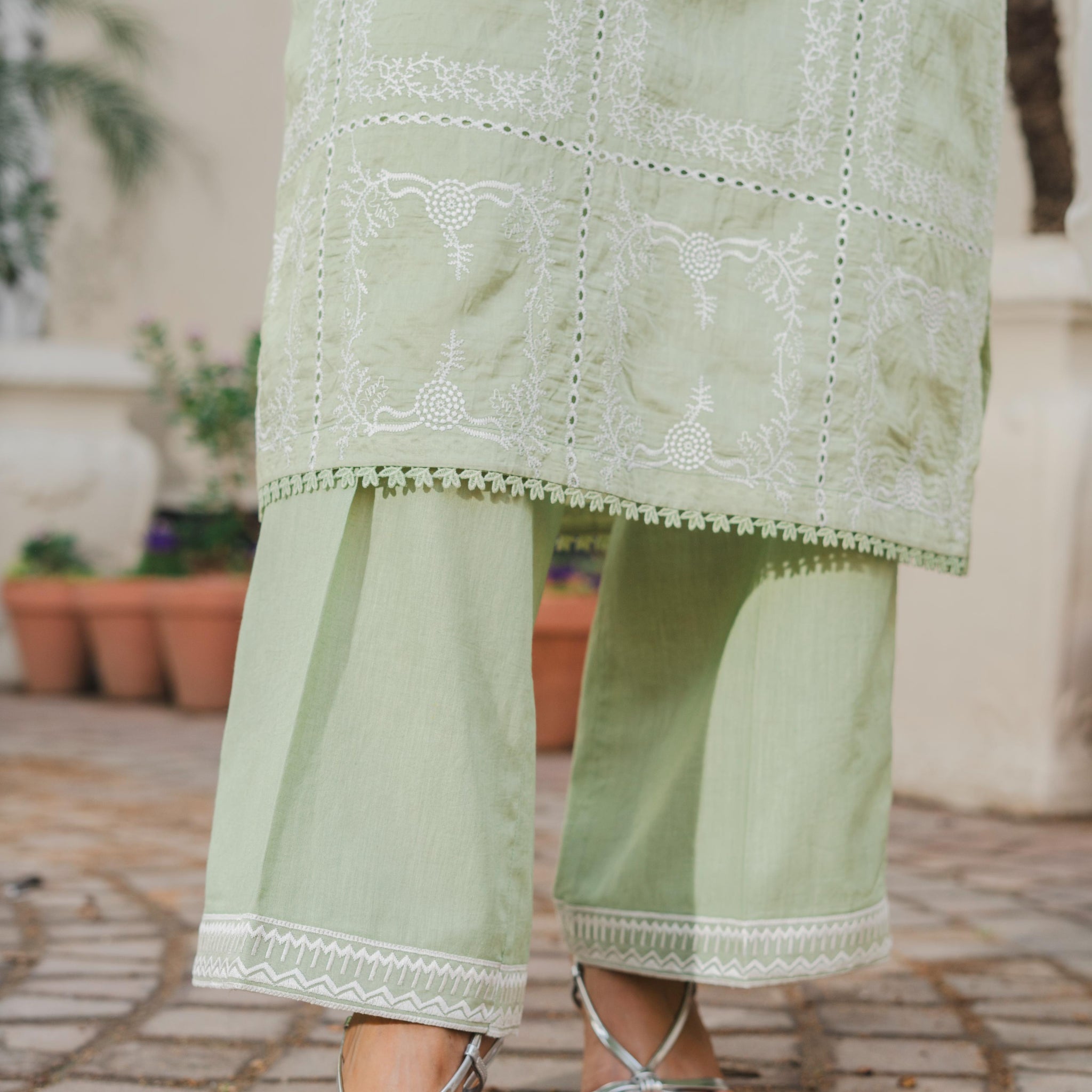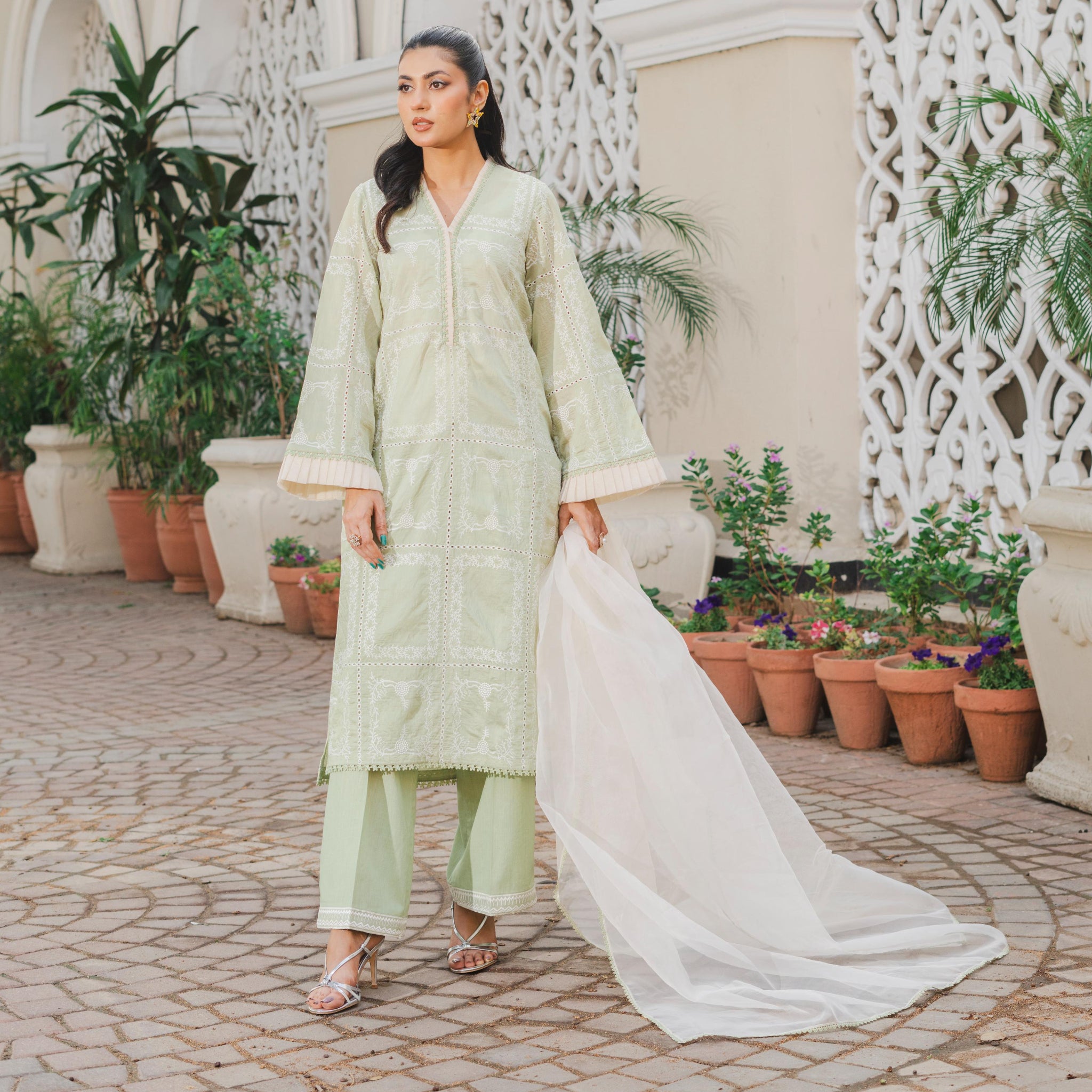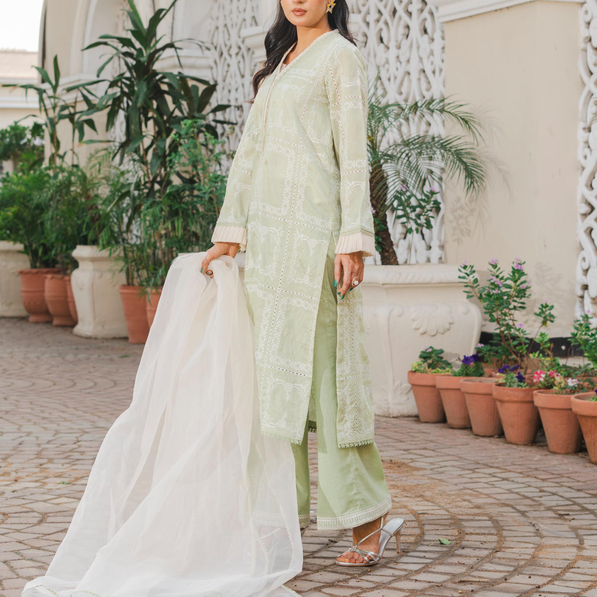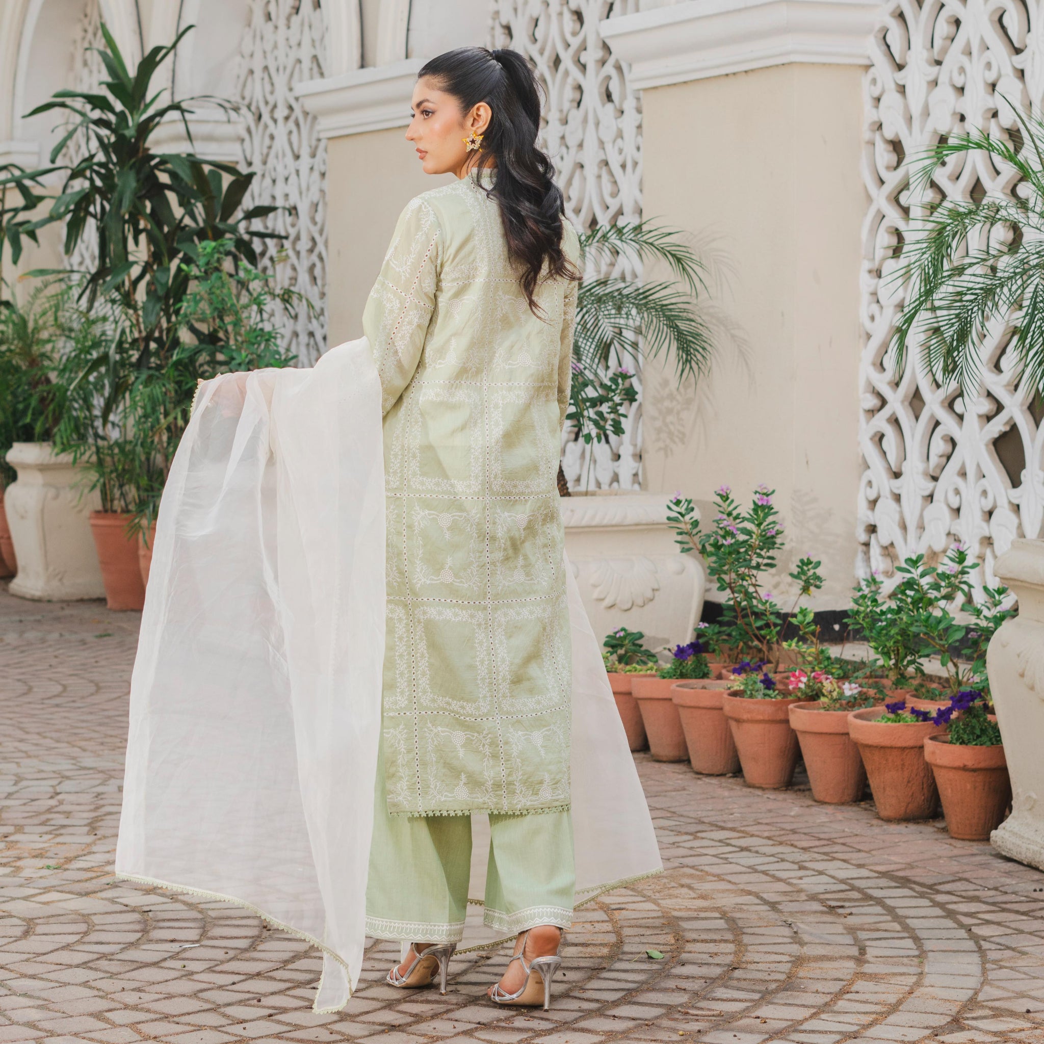 Meena - Readymade Chikankari Three Piece Shalwar Kameez in Pistachio Green with Matching White Organza Dupatta