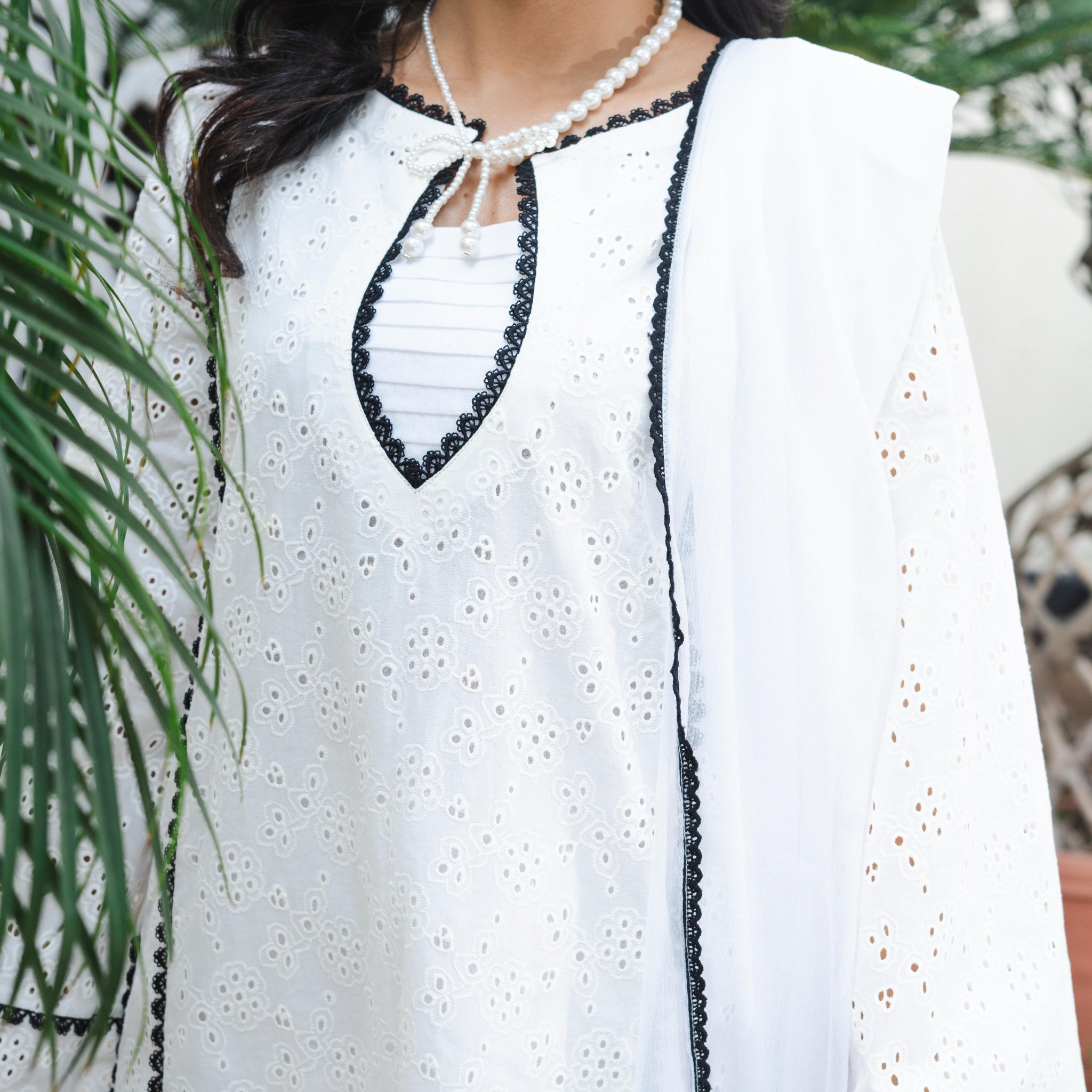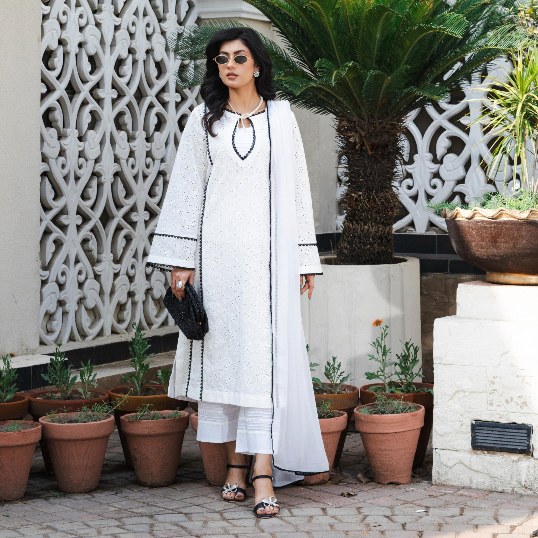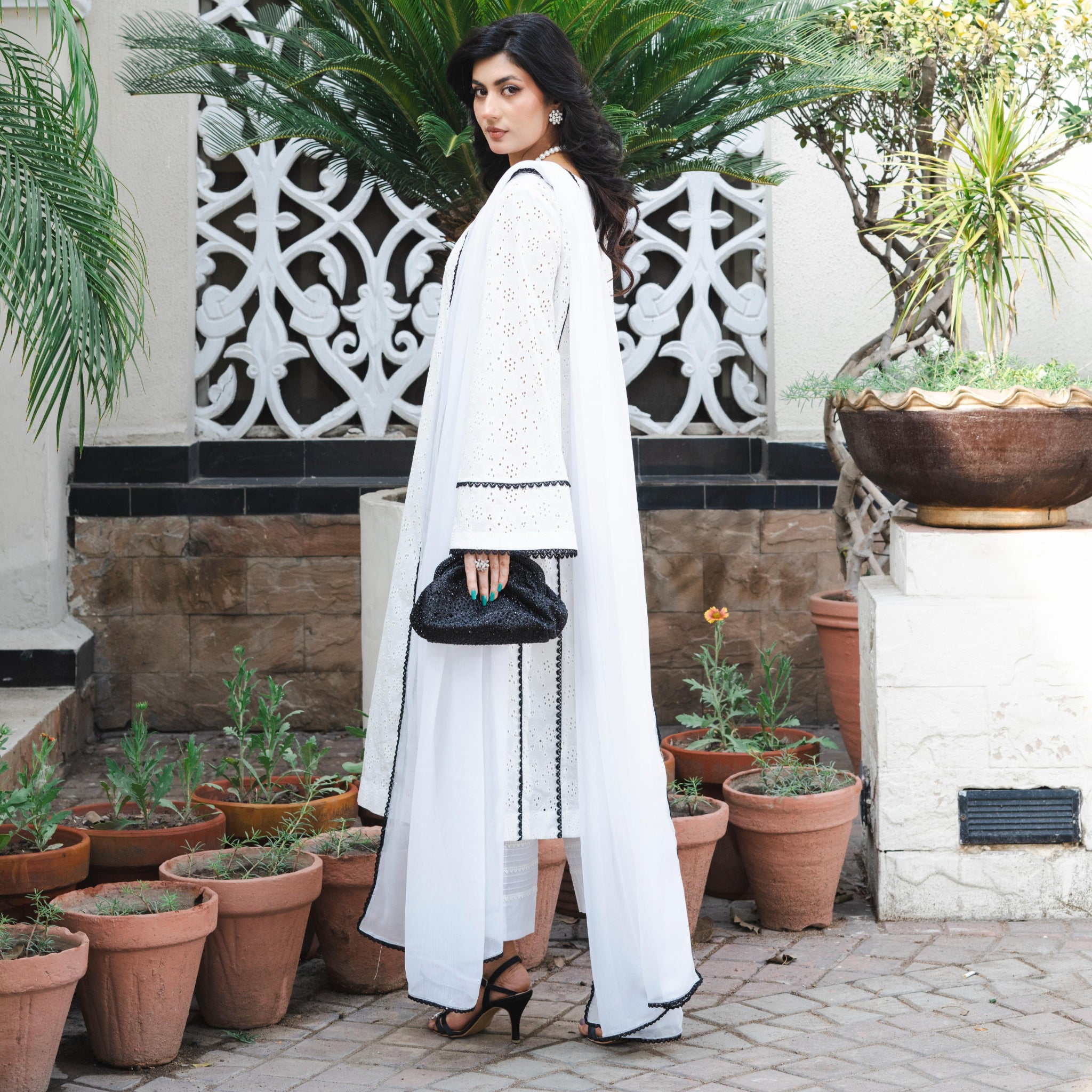 Saba - Readymade Chikankari Three Piece Shalwar Kameez in White with Matching Dupatta and Floral Detailing