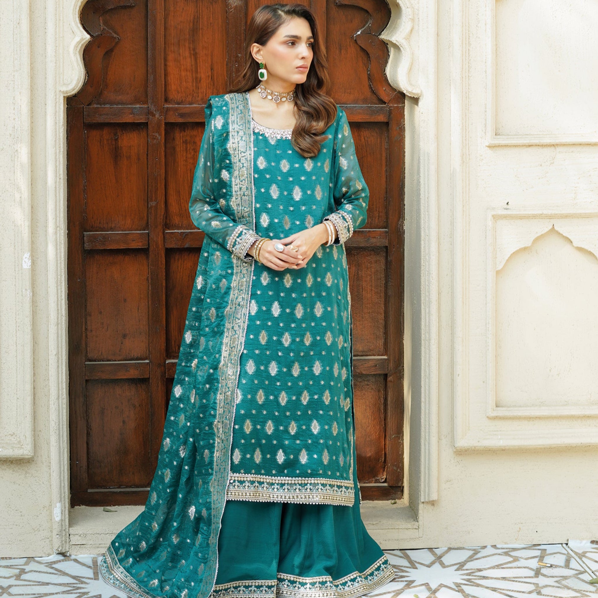 Zamurd - Embroidered Readymade Three Piece Gharara in Teal Blue with Silver Foil Print and Dupatta