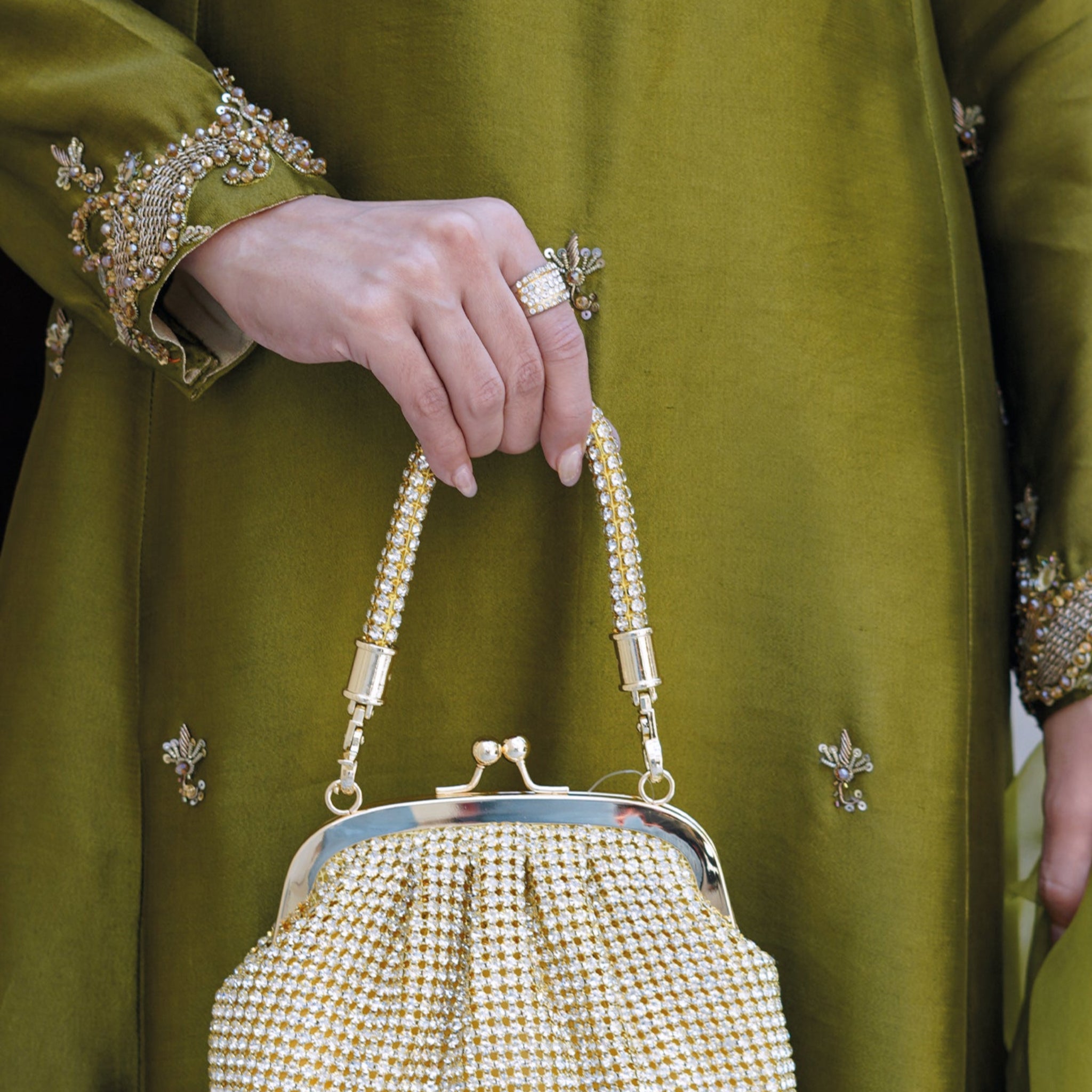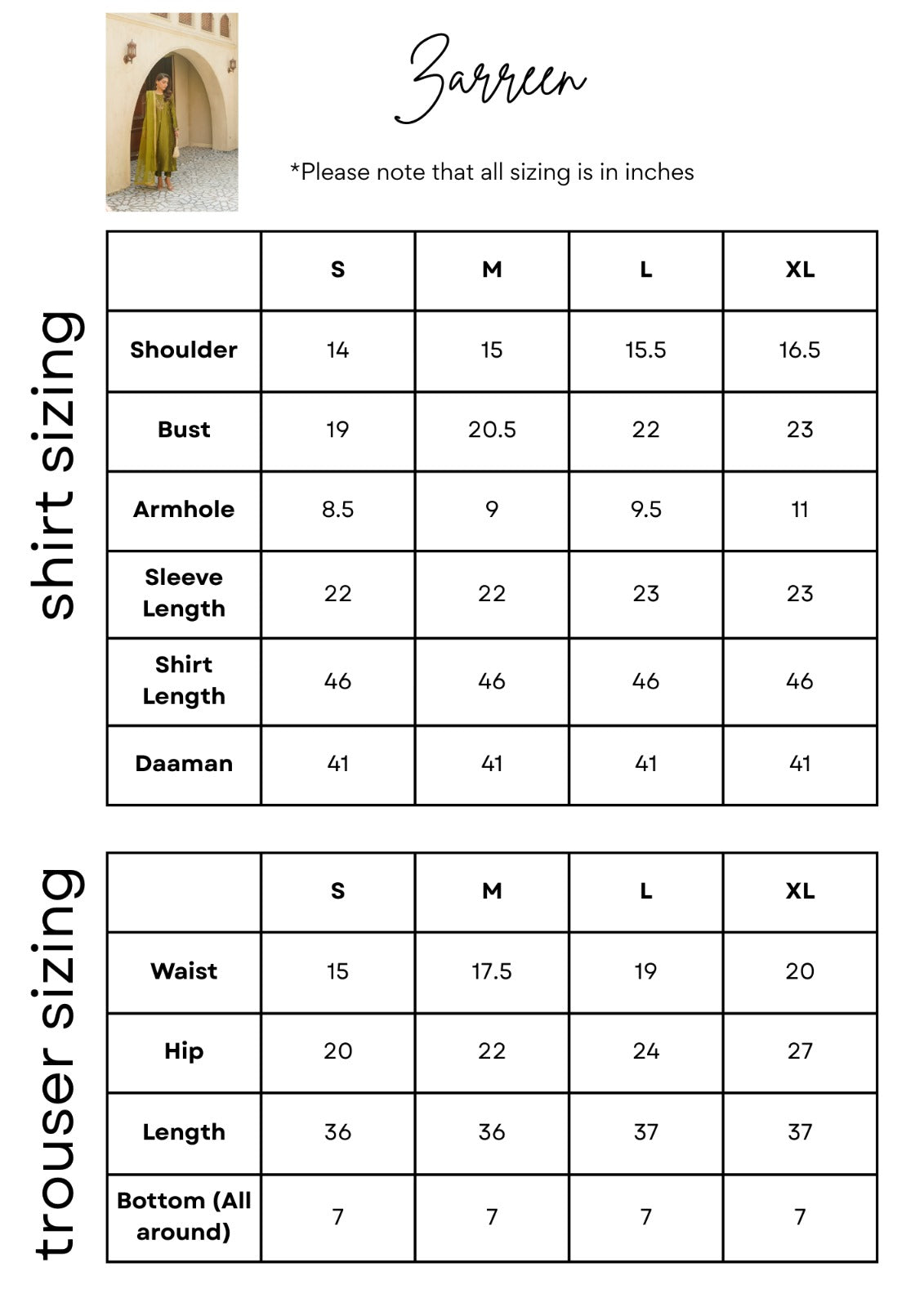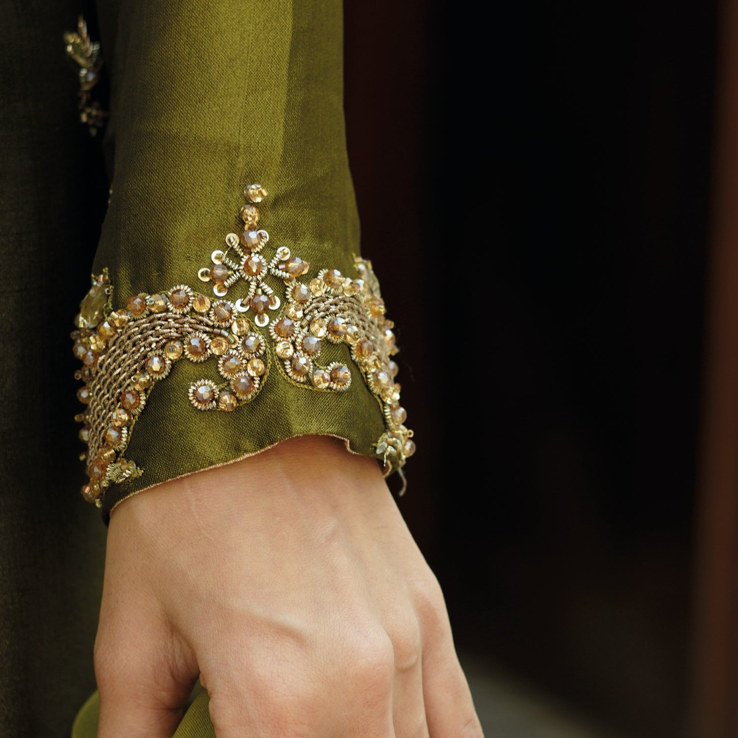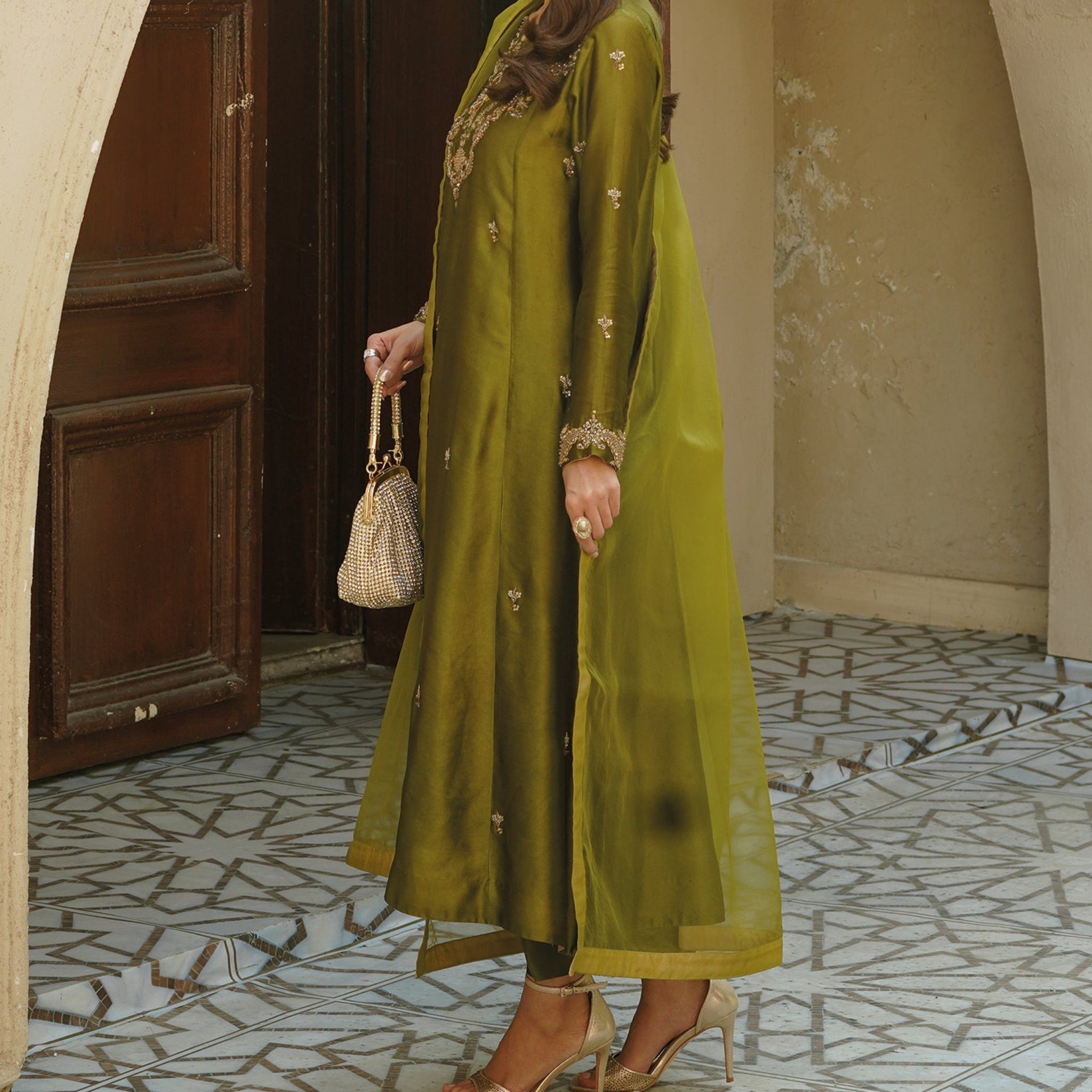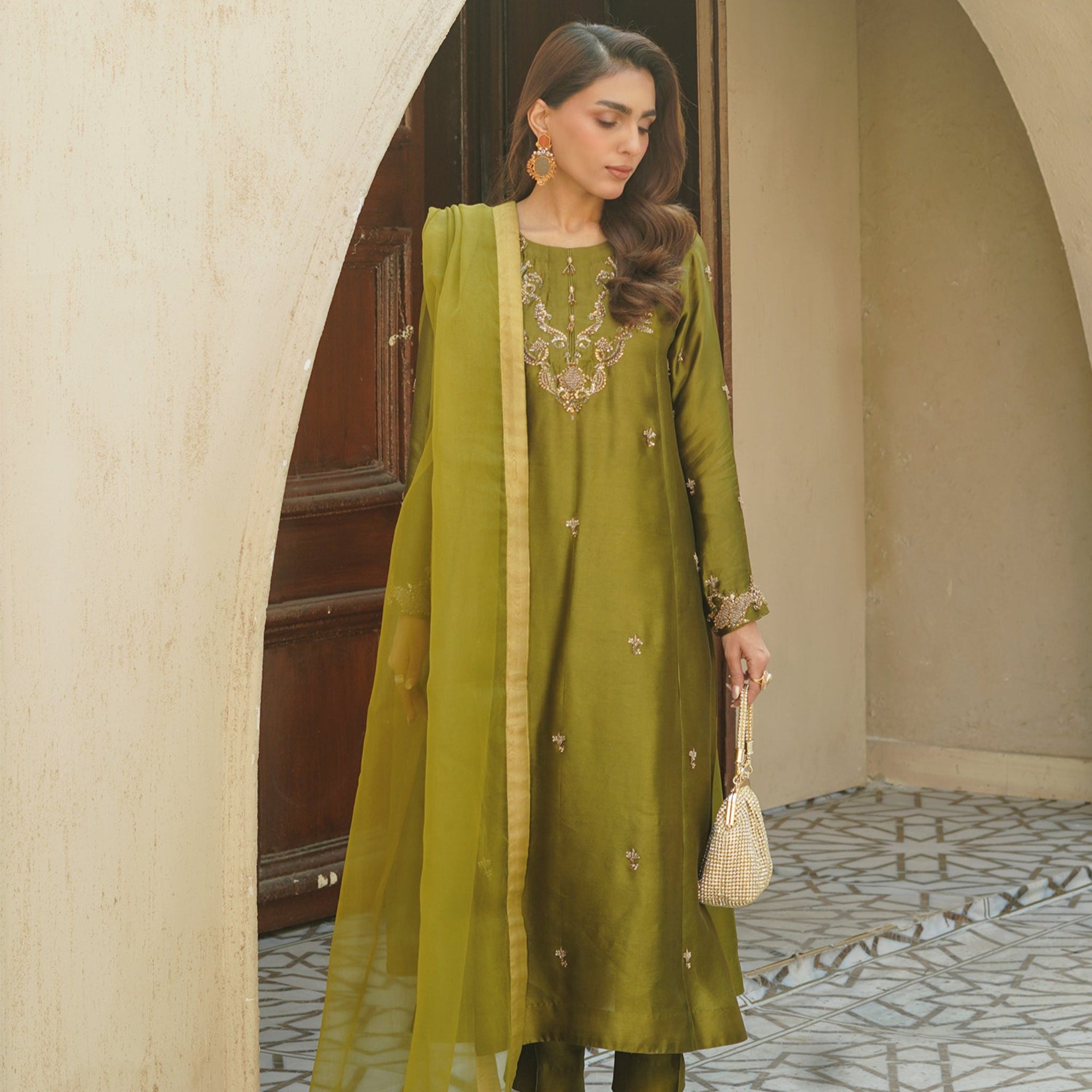 Zarreen - Embroidered Readymade Stitched Three Piece Olive Silk Suit with Organza Dupatta